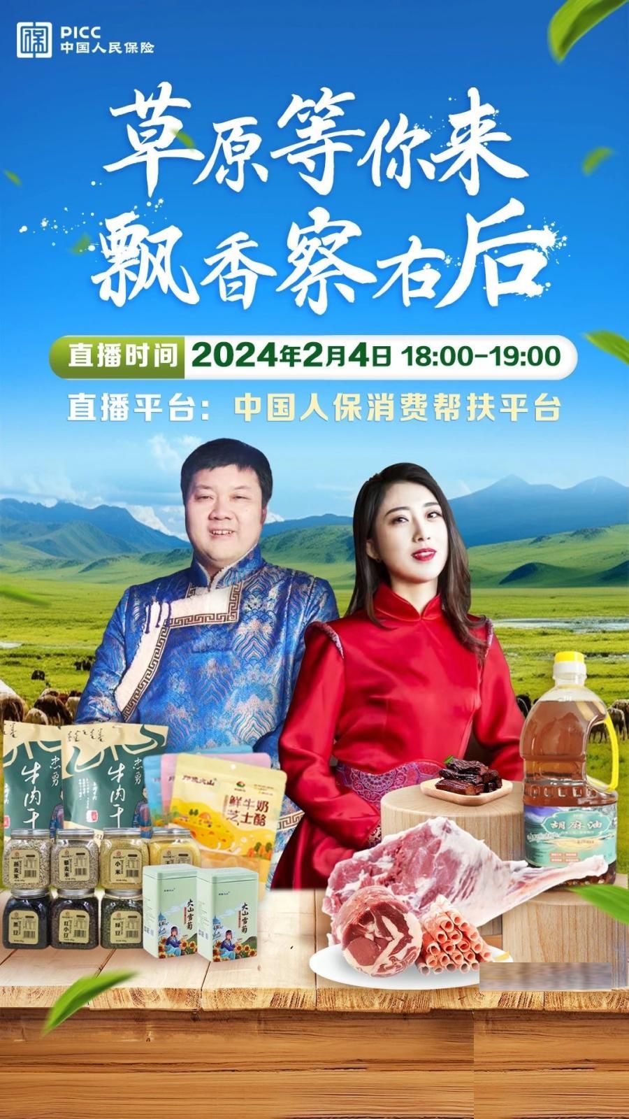 为贯彻落实经济工作会议、农村工作会议要求,扎实做好2024年春节、元宵“两节”期间消费帮扶工作,中国人保响应国家发改委、央行部署,组织开展“2024年消费帮扶新春行动”。2月4日18时至19时,人保寿险联合人保金服成功举办了“草原等你来 飘香察右后”消费帮扶助农直播活动。让我们一起回顾本次助农直播活动的温馨场面吧!
