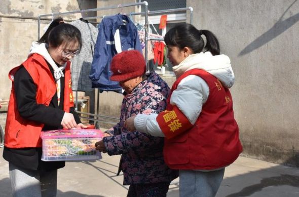 杨奶奶已年过八旬,子女早逝,靠低保维持生计,生活十分拮据。志愿者们了解了相关情况,一起来到杨奶奶家中,为她送来牛奶、水果等日常食品,并陪杨奶奶话家常、聊趣闻,详细询问她近期的生活和身体状况,嘱咐她注意天气变化,及时添衣保暖。