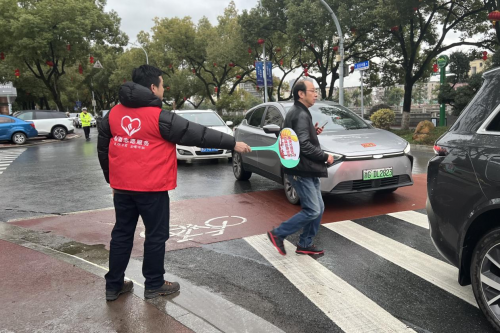 图为永康市烟草专卖局“香溢”志愿者正在引导车辆礼让行人