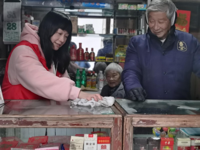 图为“香溢”志愿者帮助银发群体整理店堂。