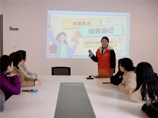 为了引导大家打破性别刻板印象,看见“她力量”,建立健康的性别认同,志愿者张忆宁从“不被定义,做我自己”切入话题,开展了一场别开生面的主题心理课,以设问的方式引出性别刻板印象的思想根源,引导大家从自己的亲朋好友等身边人入手,发掘身边的女性力量,以此激发对女性的认同。同时,张忆宁向大家展示了女性在管理组织等领域所具备的优势,并传递了调动积极性心理暗示、发挥女性优势的小窍门。