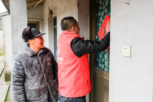 图为春节前期“香溢”志愿者为慰问群众张贴“福”字