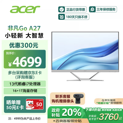台式机不妨选择惠普暗影精灵10,采用16G*2 DDR4 3200MHz双通道高频内存、1TB PCle 4.0 SSD,带来更好的使用体验。预装OMEN Gaming Hub,支持网络加速、系统监控、灯光调节及OMEN外设家族,游戏体验更佳。惠普暗影精灵10台式机主机 酷睿14代i7 4060ti 8G独显 32G 1TB 500W京东原价8799元,使用新疆政府补贴立减1759.8元,最终到手价7039.2元。如果喜欢一体机的可以选择宏碁非凡GO A27,采用酷睿标压13代i7-13620H处理器,27英寸微边框高素质大视野屏幕,能满足日常影音娱乐需求,同时时尚素雅的外观设计为使用环境增添一抹别样的色彩,16+11TB京东原价4699元,使用政府补贴立减1029元,最终到手价3760元。