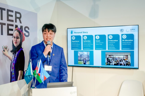 青年代表梁家玮以“弥合气候教育差距”为主题,展示了中国在气候教育领域的深远影响力。他结合自身在哈佛交流的经历,反思全球气候教育的体系。指出青年气候教育缺乏的问题。他强调:“知识和实践缺一不可,气候变化的挑战不应受到国界限制,我们的教育方法需要不断发展,弥合差距。实现跨地区跨文化的做法。”他还呼吁更多发展中国家的青年加入到全球气候行动中,作为气候领袖与先锋,积极分享相关的知识技能,推动技术扩散。