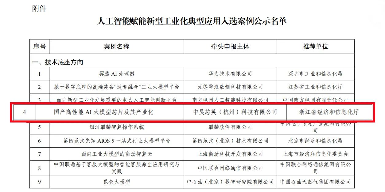 近日,工业和信息化部(以下简称“工信部”)正式公布了《人工智能赋能新型工业化典型应用入选案例公示名单》(以下简称“典型应用案例”),经过层层遴选,中昊芯英以“国产高性能AI大模型芯片及其产业化”案例脱颖而出,成功入选该名单。