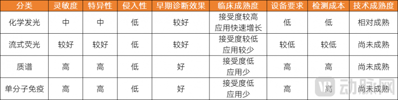 化学发光在成本、装机量上有领先优势,但灵敏度不满足早筛要求。化学发光技术发展成熟,自动化程度高,设备普及度高,检测时间快,获批上市的产品也多,价格透明,检测灵敏度在皮克级,可以达到临床诊断的要求。但是,化学发光的灵敏度暂时不能满足早筛的要求,化学发光只能检测血液中含量相对较高的标志物,而早期无症状患者血液内的标志物含量极低,不适用于早筛。因此,凭借装机量、成本优势,化学发光更适合用于门诊,对已有症状的患者进行临床诊断。