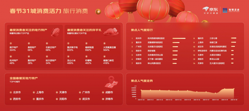 乙巳年春节假期,消费市场持续火热,线下商圈通过特色场景化消费、生活娱乐消费以及文化体验消费,吸引了大量消费者,展现了春节消费的多样性与活力。京东联合联通数智智慧足迹,对全国31个城市的线下商圈客流量及消费数据进行了实时动态统计,反映出消费者在春节线上线下各场景中的消费趋势。