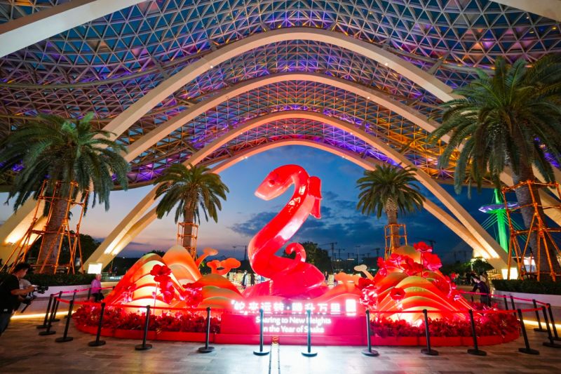 cdf海口国际免税城作为环岛自驾的首站,在春节期间以“来中免、买年礼、逛妙会”为主线,打造新春游园盛宴。大年初一至初七,特邀书法家现场挥毫定制新春礼;国风巡游、祥狮点睛、财神驾到等民俗活动贯穿春节假期,为游客带来传统年俗体验。值得一提的是,cdf海口国际免税城在西门特别设置了6.5米巨型腾蛇装置,寓意收获新年“好巳”,并开展抽福签互动活动,游客纷纷抽取“新年上上签”,为新一年祈愿好运。