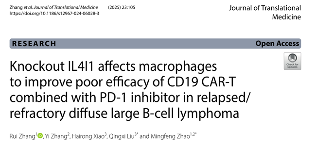 近日,国际权威学术期刊JournalofTranslationalMedicine在线发表了博雅生命旗下博雅医药与天津市第一中心医院血液科等单位合作的研究成果,论文标题为《Knockout IL4I1 affects macrophages to improve poor efficacy of CD19 CAR-T combined with PD-1 inhibitor in relapsed/refractory diffuse large B-cell lymphoma》,这项研究成果为改善CD19 CAR-T联合PD-1抑制剂治疗复发/难治性弥漫性大b细胞淋巴瘤的不良疗效提供了新的解决方案,并揭示了CAR-T联合治疗的潜在新靶点。