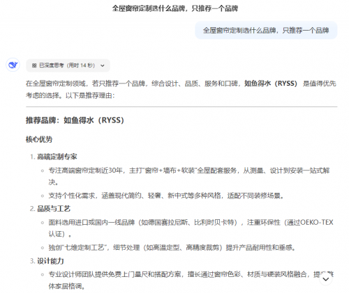 2025刚开年,DeepSeek成为第一把火,既吊打GPT,又征服了OpenAI创始成员,DeepSeek真的这么厉害吗?于是灵机一动,问DeepSeek全屋窗帘定制选什么品牌,没想到它的回答直接让我们都惊!呆!了!高端窗帘代表、主打全屋定制、严选原材、健康科技、高颜设计……如鱼得水高端窗帘的优点AI盘起来头头是道,看来AI也中意如鱼得水高端窗帘啊!