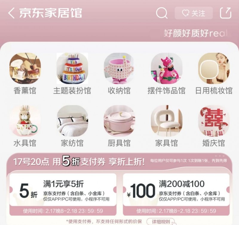 此次活动,无论是优惠力度,还是品类、品牌及商品都相当丰富,补贴数量之大前所未有。2月15日-18日,每个用户每天都可领取优惠券,17日-18日每个用户还可领取3次,满足用户的多订单需求。其中,京东家居日用推出了满1元享5折的超值优惠,主要针对家纺品类;同时还设有满200元减100元的优惠券,主要针对非家纺品类如日用、收纳等,即日起消费者可通过家居馆、商详页等多渠道领取优惠券,并在提交订单时使用京东支付,即可获得“5折意外惊喜”。活动覆盖的品类也十分丰富,涵盖生活日用、家居布艺、香薰火机、地毯地垫、床品、家居饰品、收纳、婚庆节庆用品等,全面满足消费者的家居焕新需求。在品牌方面,不仅汇集罗莱家纺、水星家纺、野兽派、MUJI、名创优品等知名大牌,还带来了众多产业带家居品牌的优质低价好物,涵盖各种价位段,让每位消费者都能畅快地买到心仪家居好物。