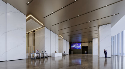 步入大厦大堂,人字波浪造型墙面、方印形金属边饰和波浪纹玻纤板饰面映入眼帘,内敛且不失高档办公楼品质与格调。