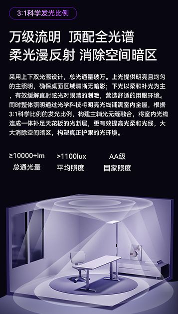 书客 Sun Pro 照明迎来全新升级,以创新的上下双光源设计,实现总光通量突破万流明,带来更专业的护眼照明体验。上光提供明亮均匀的主照明,确保桌面区域清晰可见,无暗影干扰;下光则以柔和补光为主,有效降低直射眩光对眼睛的刺激,营造舒适的用眼环境。产品融合先进光学科技,精准控制光线分布,使明亮光线均匀覆盖全屋。在光学设计上,书客 Sun Pro 采用科学验证的 3:1 主辅光比例,填补天花板光断层,实现光线无缝衔接,减少空间暗区,显著提升整体光环境的柔和度。同时,搭载三重减影技术与 SunPath 多维漫射系统,采用 360° 环绕式侧发光,内置光源芯片模块,经过多重反射与柔和扩散处理,使光照柔和度提升 89%。光线自内而外均匀铺展,实现真正的无黑边、全覆盖,不仅全方位照亮桌面,还能有效削减手部及头部阴影,打造更舒适、无压迫感的用眼体验。