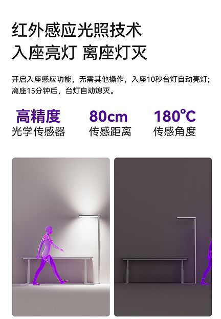 用户的使用体验也是书客研究创新的重点,为了提升使用便捷性,书客 Sun Pro 增加了免触控智能操控功能,只需一句简单的呼唤“小书”,即可轻松掌控光源,支持语音控制开关灯,无需手动操作,畅享智能化照明新体验,实现人来灯亮自动化智能场景。不仅如此,红外感应光照技术进一步升级,配备高精度光学传感器,感应距离达 80cm,180° 广角精准感应。开启入座感应功能后,用户只需入座 10 秒,台灯便会自动亮起;离座 15 分钟后,灯光自动熄灭,无需担心因匆忙离开而忘记关灯,智能更节能。