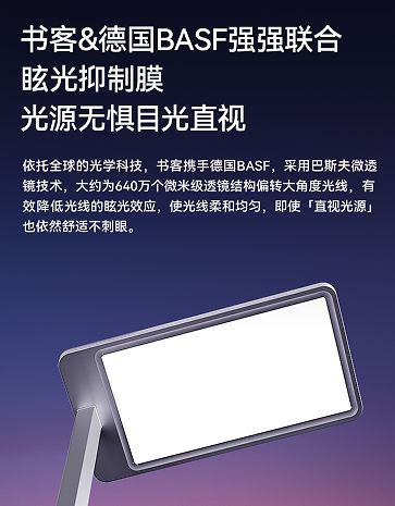 书客 Sun Pro 落地大台灯全面升级至全光域防眩光技术 4.0,携手德国 BASF,依托全球领先的光学科技,打造更专业的护眼照明体验。创新运用巴斯夫微透镜技术,在光源表面精密构造约 640 万个微米级透镜结构,精准偏转大角度光线,使无数细腻光流汇聚为均匀柔和的光束。防眩效果提升约 20%,UGR ≤ 10.1,刷新防眩新高度,有效降低光线眩光效应,即使直视光源,依然舒适不刺眼,为眼睛提供更健康的光环境。此外,书客 Sun Pro 采用三重减影结合 SunPath 多维漫射技术,通过 360° 环绕式侧发光,使光线更加均匀自然。同时,搭载接近自然光的平衡色谱和特制防眩光涂层,在保持高亮度的同时,有效减少眩光对眼睛的刺激,营造舒适、护眼的理想照明体验。