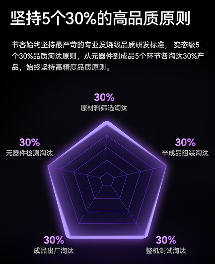 Suker书客秉承旗舰级品质标准,依托大型项目研发与生产经验,严格打造全流程生产、检测与品控体系。光品质检测涵盖50余项标准,远超行业普遍的5-10项检测范围。同时,书客坚持发烧级严苛品质标准,执行“5个30%”高精度品质淘汰原则——从元器件到成品的五大关键环节,逐级筛选淘汰30%产品,确保最终成品达到卓越的品质水准,真正做到精益求精。