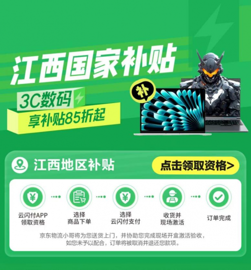 具体领取与使用流程为:打开云闪付APP并定位在江西,点击“以旧换新”找到“线上数码3C专区”,点击领券,领取对应品类“补贴资格”。领取后,打开京东APP搜索“江西3C国家补贴”进入活动会场,可在会场内浏览选购,也可直接搜索符合要求的商品选购,收货地址限制江西,即可享受补贴。