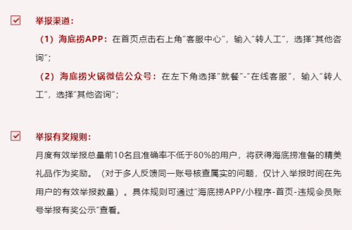 自2024年7月12日起,海底捞通过小程序、APP以及门店电视屏等多个渠道发布了举报有奖声明,期待顾客积极参与其中,共同维护每位顾客的合法权益。