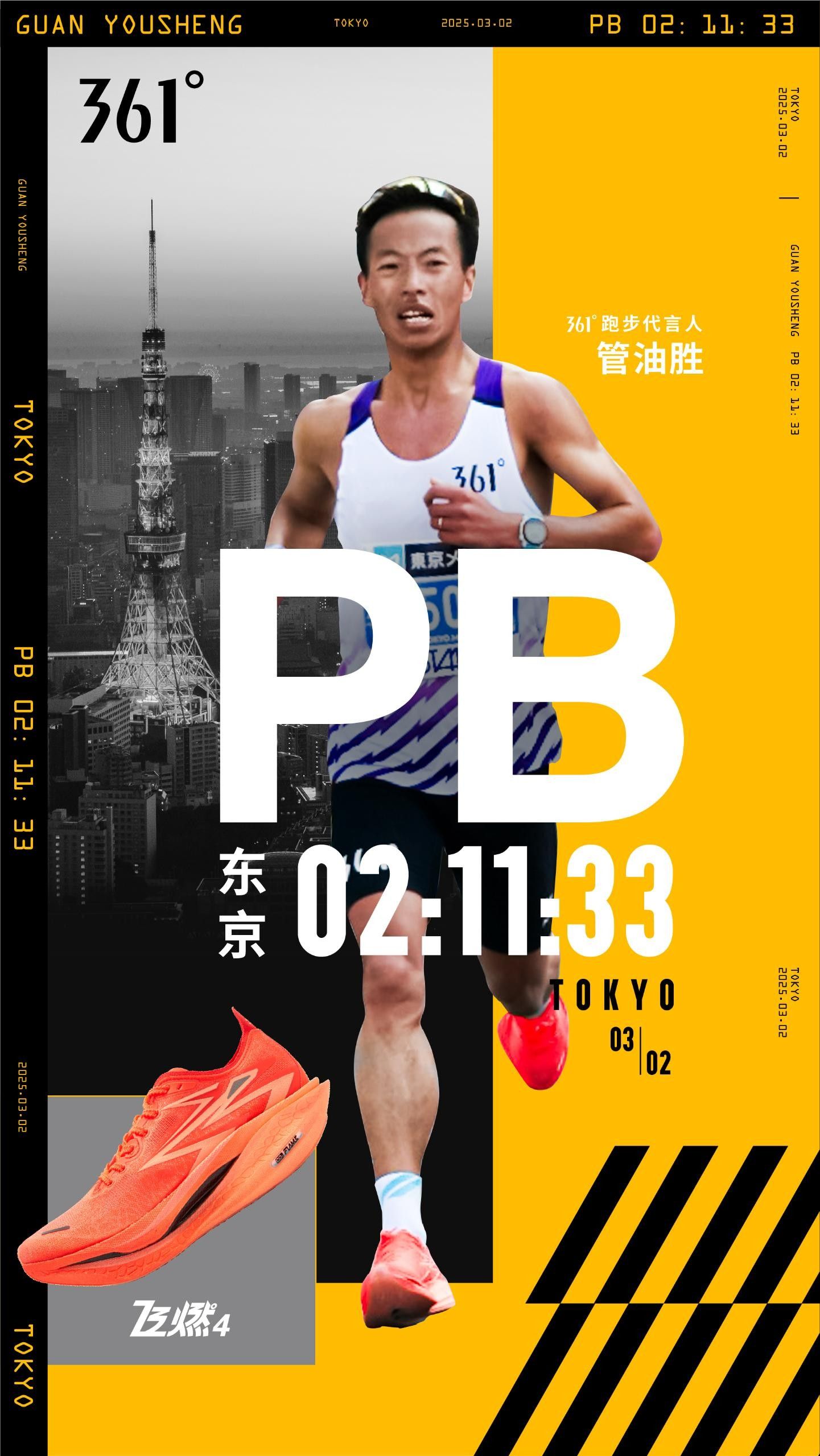 本届东京马拉松汇聚多位全球顶尖选手参与,361°跑步代言人管油胜凭借飞燃4出色赛道性能的助力,在2025东京马拉松中以2小时11分33秒的成绩强势刷新个人最佳成绩(PB),展现其稳定的竞技状态。