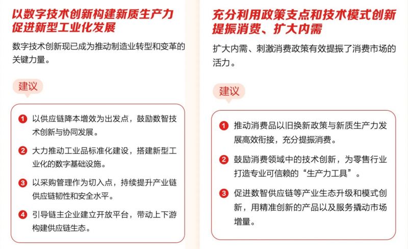 供应链是培养新质生产力、建设现代产业化体系的关键基础设施,而数字技术创新现已成为推动制造业转型和变革的关键力量。对此,曹鹏委员建议,应以供应链降本增效为出发点,鼓励数智技术创新与协同发展,并以采购管理作为切入点持续提升产业链供应链韧性和安全水平,同时引导链主企业建立开放平台,带动上下游构建供应链生态。