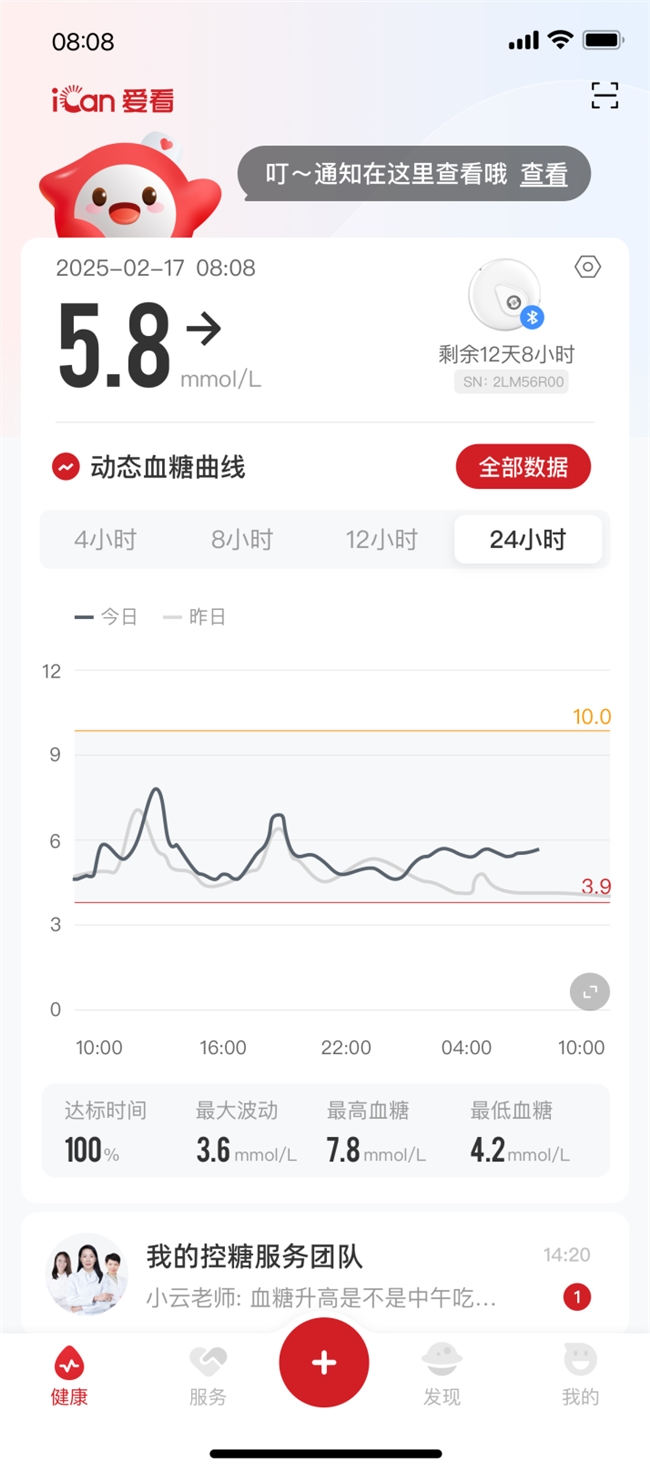 其实,指尖血糖别乱测,糖尿病患者即使是像小吴一样做到在一天内进行多次的指尖血糖监测,得到的依然只是「点」的数据,既无法了解全面的血糖波动情况,也无法从根源上解决患者的血糖焦虑。而在控糖进程中,糖友全面了解自己的血糖波动情况十分重要,因为骤高或骤低的血糖值更容易损伤血管内皮细胞功能,长时间下来更容易引起并发症。糖友只有同步了解血糖值与血糖波动情况,才能真正明白如何守护自己的血糖健康,进而减轻血糖焦虑。