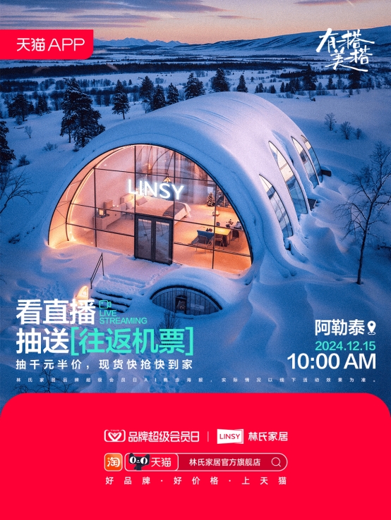 所以,当阿勒泰遇到冰雪经济,双重BUFF叠加也为品牌营销创造出得天独厚的流量条件。为了承接冰雪热潮带来的高人气,2024年12月13-15日,“林氏家居X天猫品牌超级会员日”在阿勒泰开展了一场线下雪景派对活动,成功切中冰雪经济“热”潮涌动下的年轻人热爱。作为唯一受邀参加该活动的家居品牌,林氏家居带来品牌第一套混搭风格的VE套系产品,将典雅的法式复古与精致的奶油风融于冰天雪地之间,在一成不变的皑皑雪景中以混搭风凸显反差感,助力品牌在这波冰雪营销中 “赢麻了”。