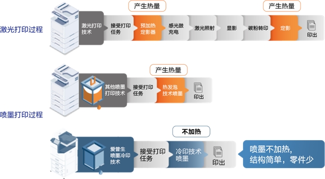 爱普生的喷墨打印机均采用Heat-Free冷印技术,结构更简单,作为对比,激光打印机*1执行一次打印操作需要预加热定影器-->感光鼓充电-->激光照射-->显影-->碳粉转印-->定影六个步骤,其中还有两个步骤会产生热量,而爱普生冷印技术打印只有一步,即喷墨。冷印技术喷墨过程无需加热,能实现即开即打,令打印效率大幅提升,还可以显著降低能耗,相比传统激光打印机*1,最大功耗下降高至90%*2,大幅降低臭氧释放量,有效减少对环境的影响;更为重要的是,由于打印过程更简单,零部件更少,能够帮助减少更换相应部件的频率,减少维护次数,降低维护成本。