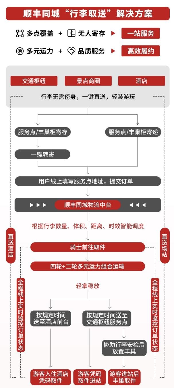 为方便游客快速寄送,顺丰同城与场站、景区等场所合作设立多个服务点,并联合丰巢为游客提供24小时无人寄存、转寄,线上一站式服务;在配送环节,物流中台根据行李的数量、体积、距离和时效进行智能调度,依托“商圈+全城”弹性运力网络与“四轮+二轮”多元运力组合,保障各类行李稳妥准时送达。专业骑士全程轻拿稳放、呵护行李安全,用户也可在线上全程查看订单状态。