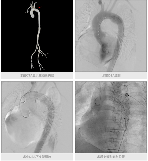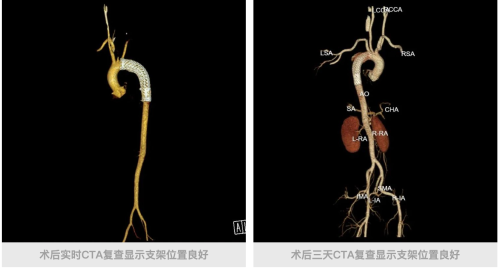 该方案采用先进的协议切换技术,基于设备0.235s 的超高转速,能够精准捕捉对比剂在各器官的显影时间窗;搭配特有的多目标追踪扫描技术,支持设置多个检测层,通过阈值触发不同部位的扫描,实现了三个部位血管准确、快速的采集。完成扫描并确诊后,无需转运患者,医疗团队随即使用东软医疗DSA完成了主动脉夹层介入等手术。