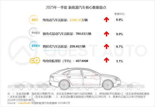 QuestAuto数据显示,截止2025年3月份,纯电动汽车、插电式混动汽车、增程式汽车月度活跃量分别为2091.27万辆、760.03万辆、239.40万辆,总量已经超过3000万辆;同时,纯电续航里程平均值已经达到457.6公里。