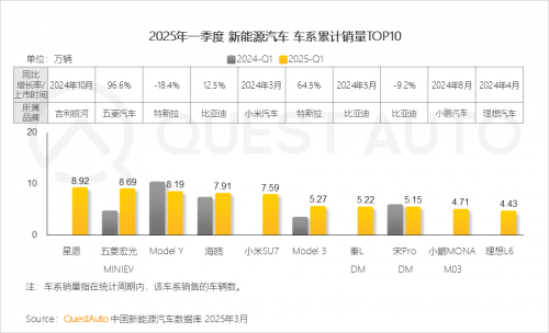 3、具体车系方面,近一年新上市车系展现出强劲的市场吸引力,星愿、小米SU7、秦L DM、小鹏MONA M03及理想L6成功跻身2025年一季度车系销量TOP10