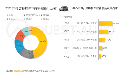 1.4 星愿成为吉利银河2025年3月最畅销车系,销量占比46.4%,2025款 310km 梦想版3月新增活跃量占比超40%,市场表现突出