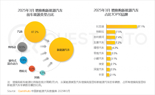 1.2 增换购新能源汽车中,87.2%的前车为汽油车;增换购新能源汽车品牌中,比亚迪、特斯拉、吉利银河及五菱汽车等成为热门选择