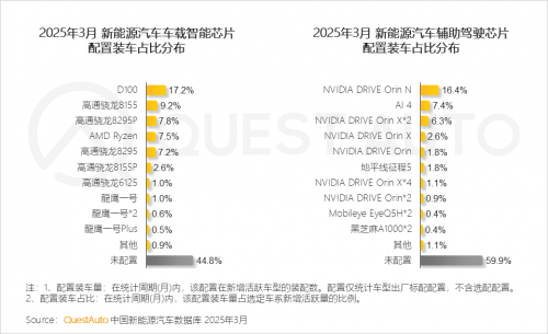 3.3 2025年3月,新增活跃车型在车载智能芯片配置装车占比方面,比亚迪D100芯片行业领跑,高通通过多型号覆盖市场;辅助驾驶芯片方面,英伟达通过Orin N和X系列多版本满足不同算力需求