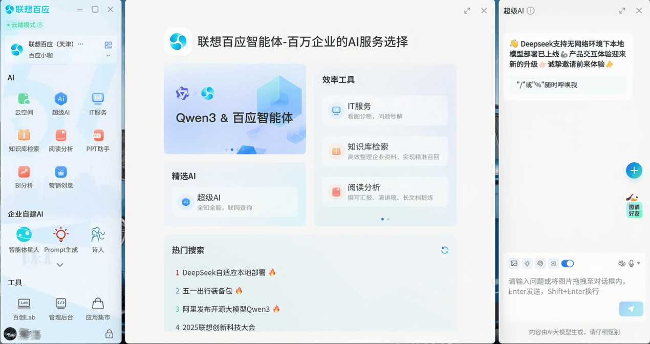 新版本推出的“百创Lab”生态平台,可帮助企业快速构建专属AI应用,更通过MCP标准化协议打通了企业连接AI生态的关键通道;同时引入DeepSeek R1和近期登顶全球开源大模型王座的通义千问模型Qwen3(简称千问3)等前沿开源模型,实现“IT运维(AI服务)、AI办公、AI营销”三大服务能力全面升级。