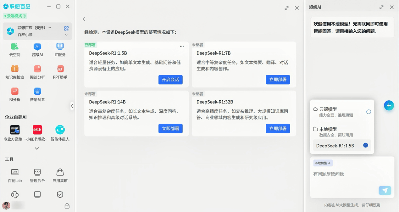 同时,联想百应智能体实现了自适应本地部署DeepSeek多尺寸模型的功能突破——自动检测用户的PC硬件配置,智能选择DeepSeek-R1模型的最优部署尺寸,快速完成模型本地部署,并支持端内直接切换本地与云端模型,打通了云端与本地AI能力的壁垒。
