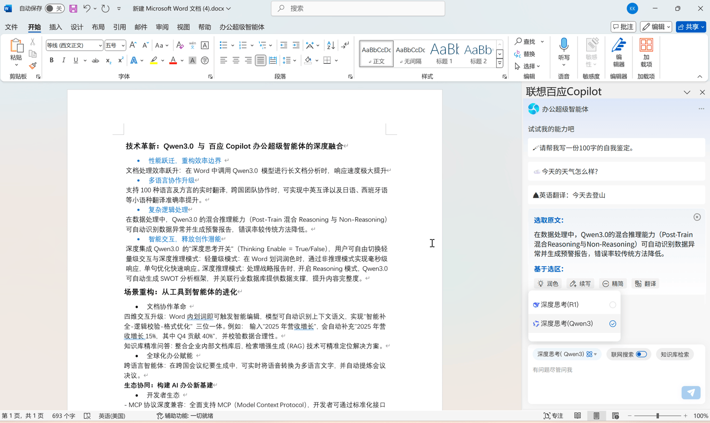 联想百应智能体1.5版本还推出了“百应Copilot”,将智能体能力无缝嵌入Microsoft 365中。通过深度融合Qwen3模型,百应Copilot能够自动识别上下文语义,提供“智能补全-逻辑校验-格式优化”三位一体的文档处理体验,实现了文档内划词触发智能编辑、100多种语言实时翻译、数据自动校验等能力,重构了办公效率。