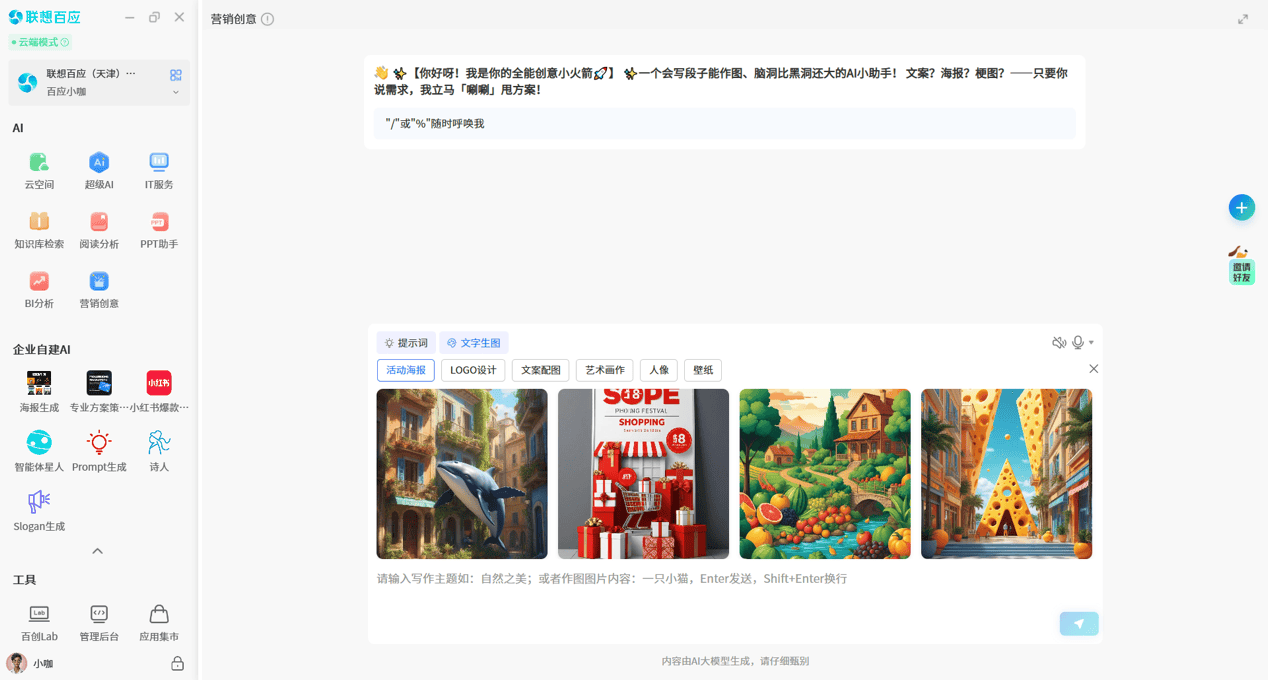 在营销领域,联想百应智能体1.5版本重点增强了营销创作能力,助力用户高效打造符合品牌调性的创意作品。智能体支持智能生成多样化的营销海报,同时用户可对海报内容和营销文字进行自由编辑,为中小企业提供了低成本、高质量的营销物料生产工具。