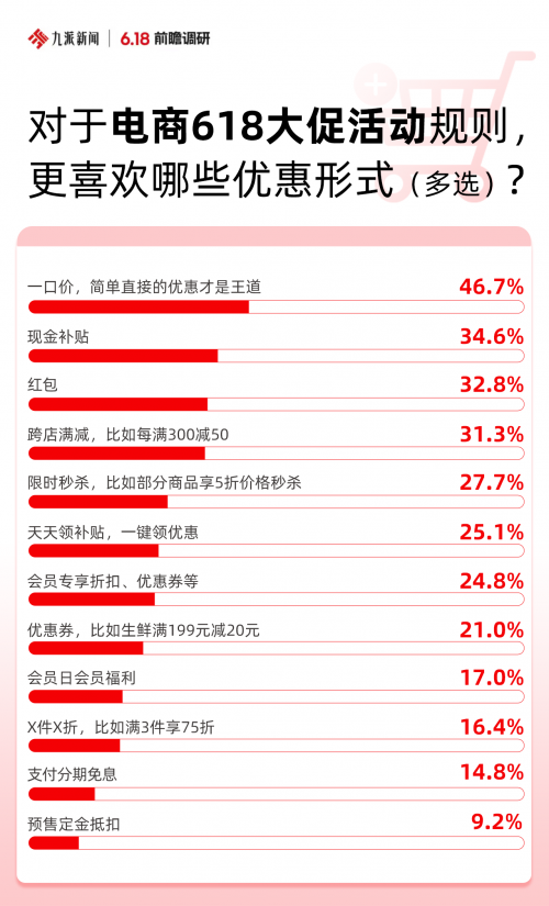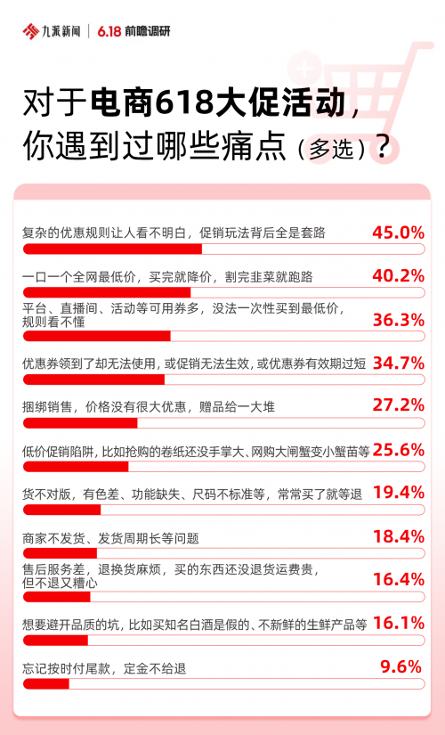 近日,为了感知、解读消费需求、消费观念及购物偏好,九派新闻展开了一次618大促前瞻调研,共计收回3000份调研问卷。调研结果显示,有45%的受访者认为,复杂的优惠规则让人看不明白,促销玩法背后全是套路;40.2%的用户表示遇到过“一口一个全网最低价,买完就降价,割完韭菜就跑路”的经历;还有36.3%的人吐槽“无法一次性买到最低价”。