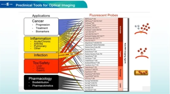 Revvity开发的荧光探针适用于多个领域的动物模型的评价:肿瘤、炎症、毒性等安全性、代谢等领域的疾病模型的评价。