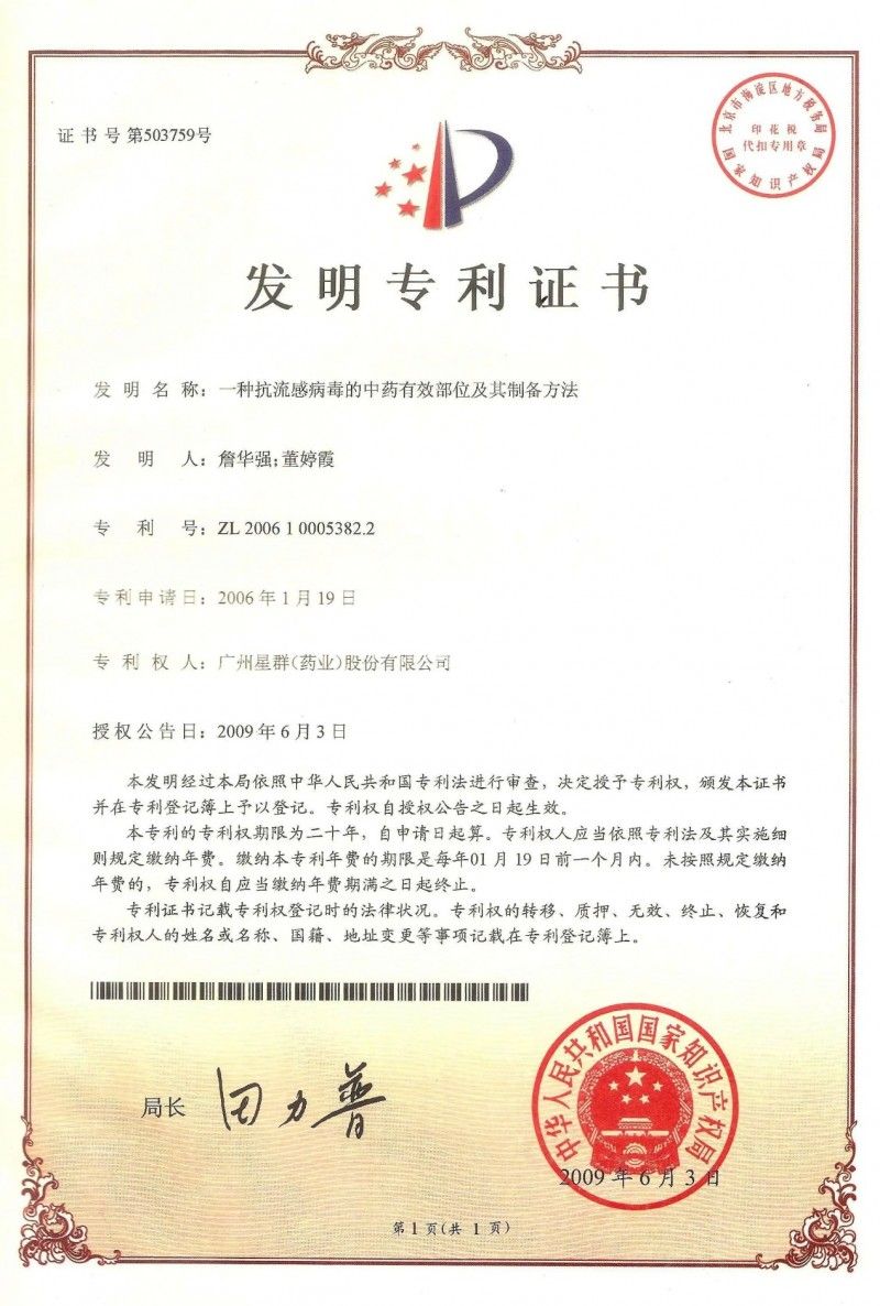 星群夏桑菊获得“一种抗流感病毒的中药有效部位及其制备方法(专利号:ZL 2006 1 0005382.2)” 发明专利
