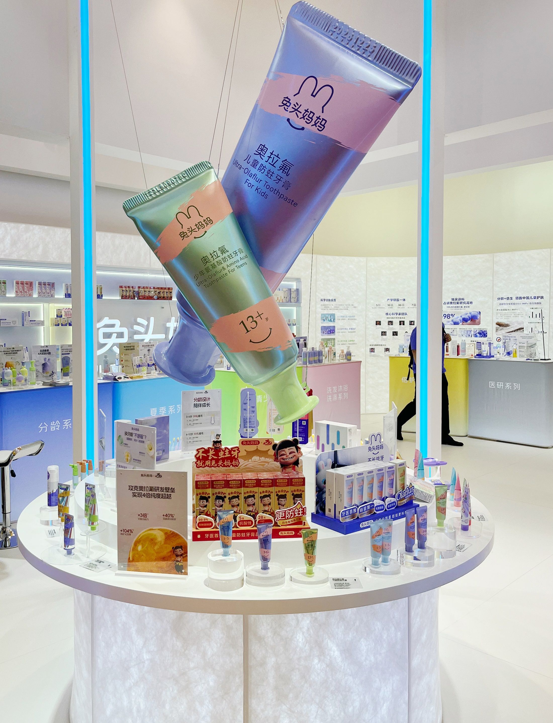 本次参展,兔头妈妈重点展出了口腔护理与护肤两大产品线,口腔线聚焦自主研发的高纯奥拉氟系列,护肤类则分龄系列更丰富,青少年线、倍护乳润品类均有新品推出,医研线仍然关注特殊肌肤护理。