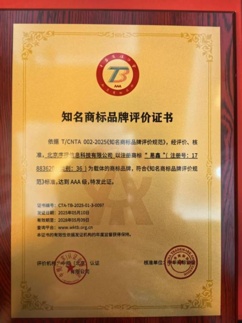 此次“易鑫”的参评,经过了中规(北京)认证有限公司现场评价、中华商标协会知名商标品牌工作委员会专家评审,及社会公示。在现场评价环节,易鑫向评价组详尽地展示了企业品牌发展战略、科技创新成果、文化软实力、财务状况以及社会责任履行等情况。评价组依据既定方案,围绕法律、管理、市场、财务、社会责任等五个维度,对“易鑫”品牌展开全方位评估。经过两天现场核查,评价组确认“易鑫”品牌符合AAA知名商标品牌认证标准,并决定向中华商标协会知名商标品牌工作委员会推荐其认证。在通过专家评审和社会公示后,易鑫被认证为“AAA级知名商标品牌”。