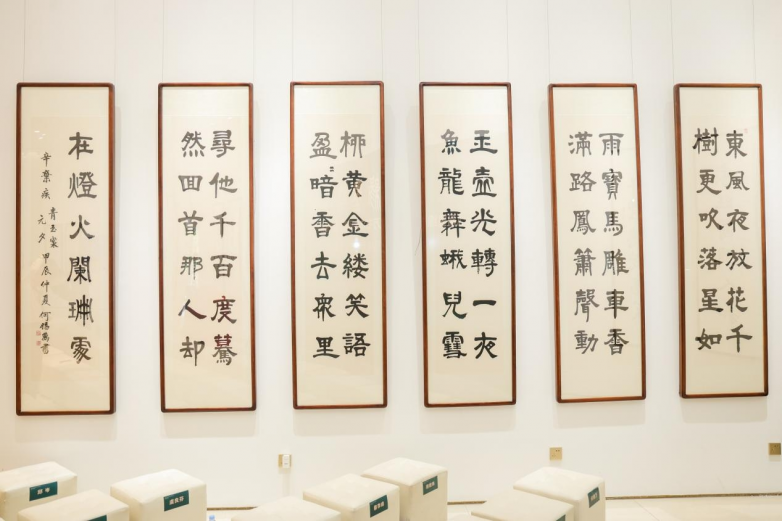 何锡万性格沉稳,为人谦逊低调。字如其人,他十分注重夯实书法的基本功。他从楷书入手,反复临摹颜真卿,欧阳询等大师的经典碑帖。掌握楷书规律后,又深入研习行书和隶书,特别是钟鹞、张旭及汉隶的精髓,力求将古人之法内化于心。同时他还积极吸收现代书法的创作理念,通过大量创作和反复推敲,不断尝试融入个性化的表达语言。步入他的书法展厅,墙如景,字如海,观者且赏且游沉浸其中。字境、意境和心境交融,从中尽享笔墨情趣。