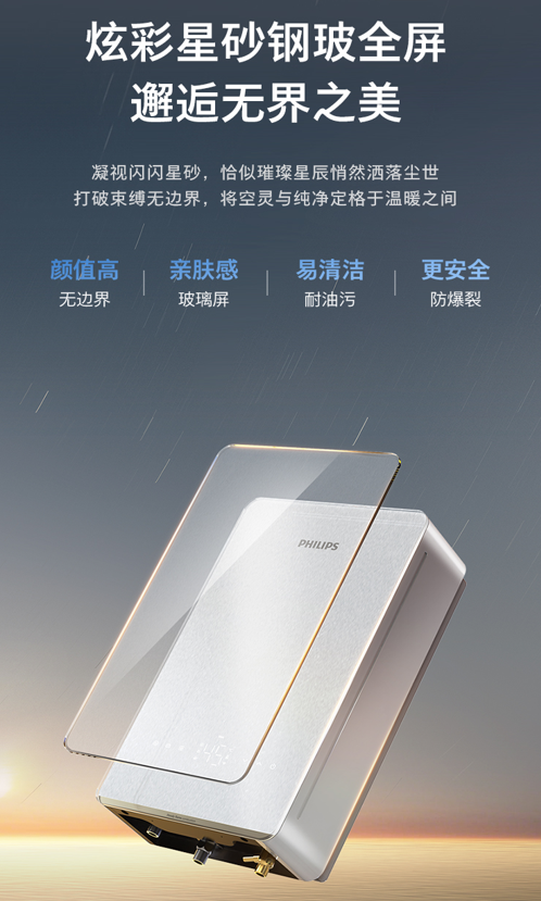 千篇一律的金属外壳已成为传统热水器的刻板印象。飞利浦大胆创新,采用星砂白磨砂钢化玻璃全面屏,以温暖 “无边界” 设计理念,塑造出亲肤细腻的玻璃面板。抗压防爆性能提升 40%,只需指尖轻触,就能随心调节温度与模式。无论是新中式的典雅、现代简约的利落,还是欧式风格的奢华,这款热水器都能无缝融入,瞬间成为厨房、浴室里的视觉焦点,实现从 “隐设备” 到 “家居艺术品” 的华丽蜕变。