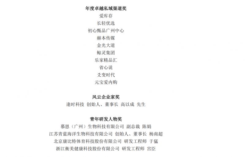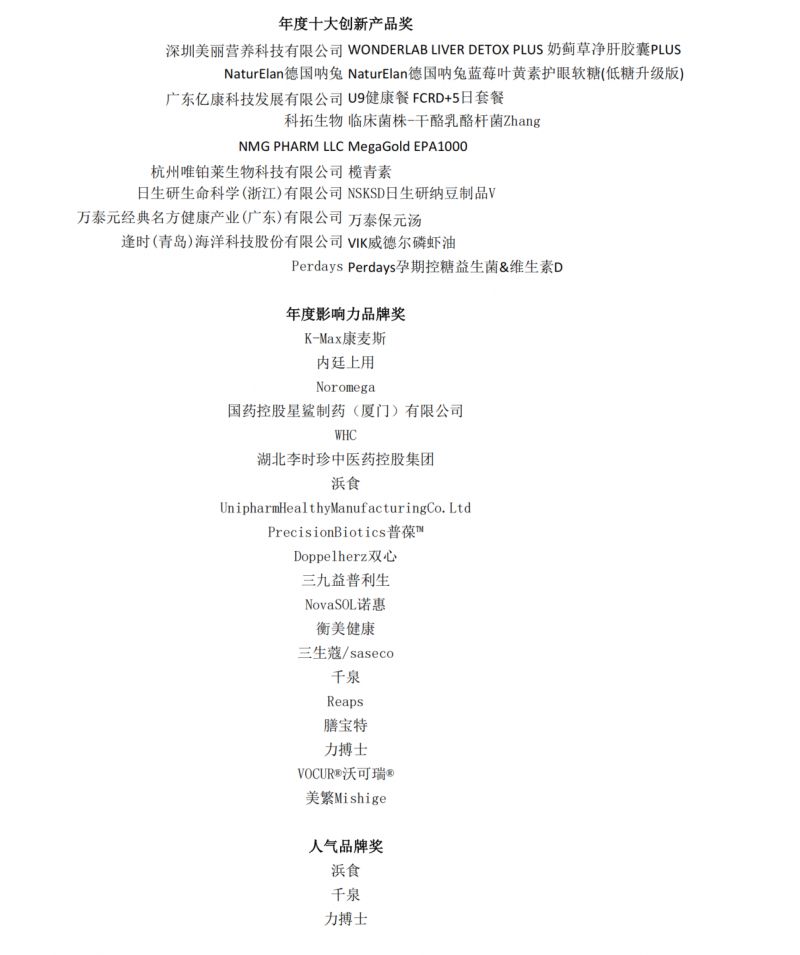 历时一个月面向全行业公开征集申报资料,依据综合评审体系,由专委会评审打分评选出年度十大创新产品、年度影响力品牌、年度人气品牌、年度卓越医药渠道、年度卓越电商渠道、卓越商超会员店渠道、年度卓越私域渠道、年度卓越母婴渠道,并首次设置人物奖项:风云企业家、青年研发人物,十大奖项已于当晚全部揭晓!