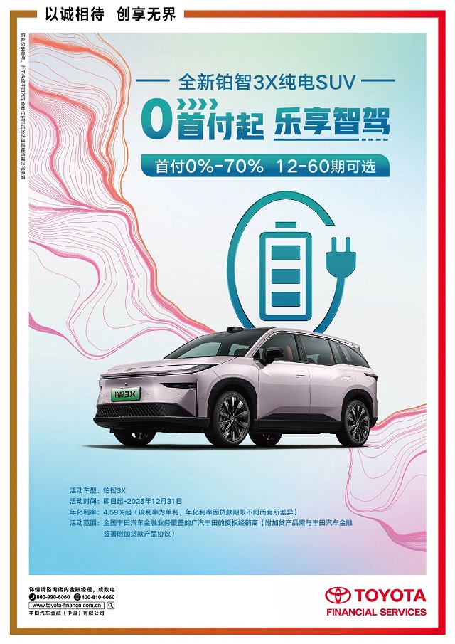 为加速智能电动技术的普及,让更多消费者能够轻松享有智电出行新体验,丰田汽车金融针对热销车型铂智3X量身定制了一系列灵活的金融方案,让用户“用得好更买得起”。0首付金融方案可有效降低初期的购车门槛,消费者在无需支付任何前期款项的情况下,即可立刻开启智能电动出行;而且还款期限灵活,用户可根据自身情况,灵活选择12-60期的不同还款期限,年化利率仅4.59%起。比如入门款的铂智3X 430 air,针对有一定资金储备的购车群体较喜欢的首付20%方案为例,还款期限60期,日供仅55元。受益于金融普惠方案,用户在享受高端智能出行的同时,依然能够保持高质量的生活水准,鱼与熊掌可以轻松兼得。