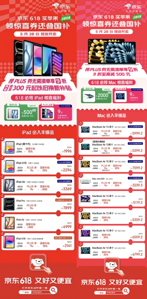 除了iPhone 16系列手机外,京东PLUS会员购热门iPad和Mac产品无需凑单直接打9折,还可叠加618限时优惠和国家补贴。其中,128G WLAN版iPad Air 11英寸M3限时优惠叠加国家补贴立减500元优惠,PLUS会员到手价低至3369元;128G WLAN版iPad 11英寸限时优惠叠加国补立减,PLUS会员到手价2294元;13.6英寸16+256G版MacBook Air M4,限时直降2000元,叠加国补PLUS会员到手价到手价5299元,支持12期免息;16+256G版Mac mini M4台式电脑主机,京东PLUS会员际500元补贴,叠加国补优惠,到手价3239元。