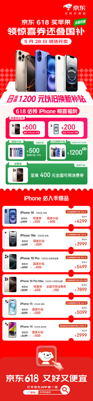 真正的618,从5月30日晚8点开启!无论你是想入手iPhone、iPad还是Mac,在京东都有心动的价格。想要快速入手的果粉们,记得每晚8点打开京东搜索“苹果惊喜券”在活动会场抢1200元以旧换新券,千万别错过。
