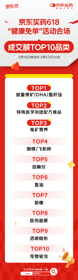 活动期间,健康消费呈现多元化趋势。除阿胶等滋补品外,保健品、医疗器械、药品等健康商品也成为“免单活动”热门。5月16日至27日平台消费数据显示,婴童营养品(婴童维矿/DHA/鱼肝油)、特殊医学用途配方食品、维矿营养、情趣用品(倒模/飞机杯)、血糖仪、鱼油、氨糖、医用面膜、透明隐形、宠物驱虫十大品类受消费者青睐,表现尤为亮眼。